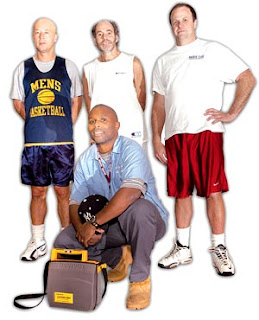 From left, teacher Charlie Bateman, dentist Alan Katz, and publisher Lee Minetree were part of the rescue team for Dexter Grady, shown in foreground with an AED.